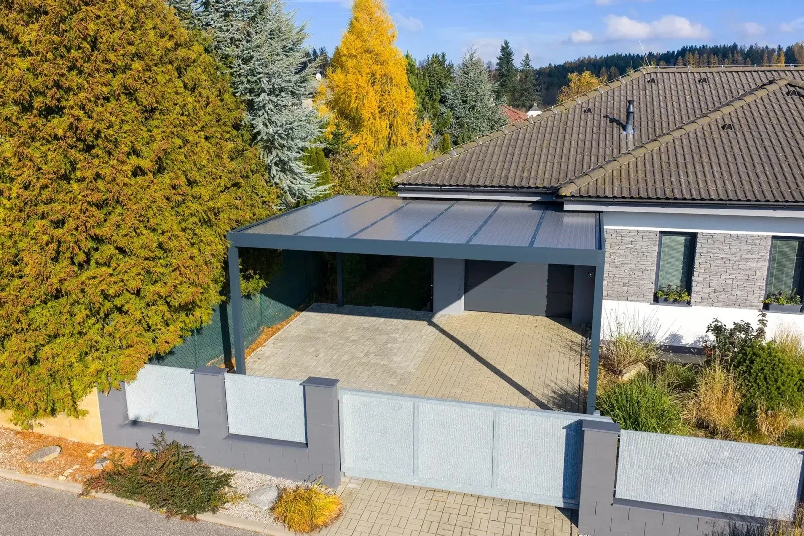 Rám přístřešku je k dispozici v několika barevných variantách, které jsou chráněny odolnou komaxitovou barvou. Tato povrchová úprava nejenže poskytuje dlouhodobou ochranu proti poškození, ale zároveň umožňuje sladit přístřešek s okolním prostředím či domem.