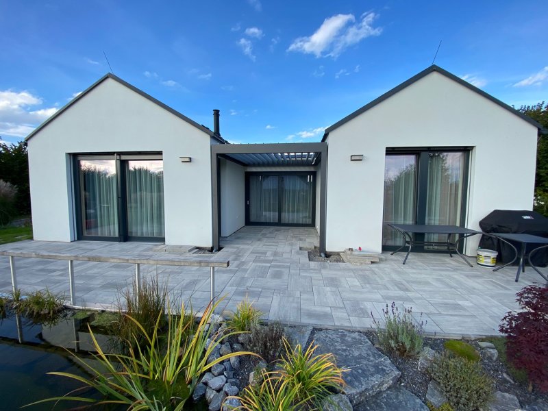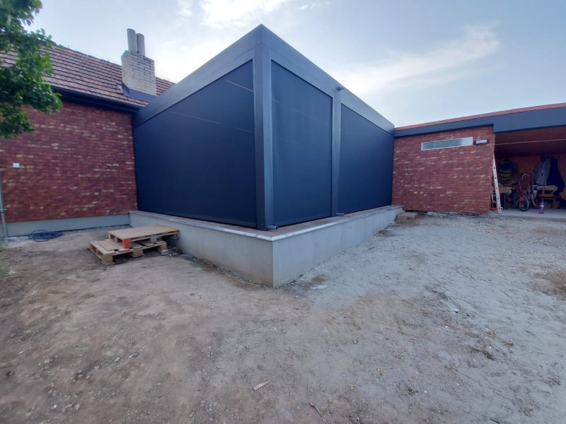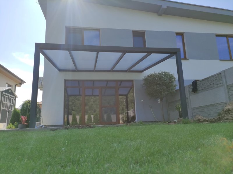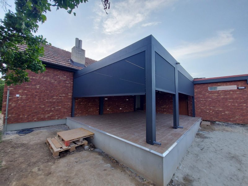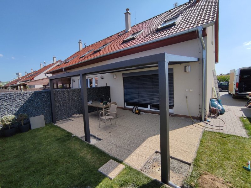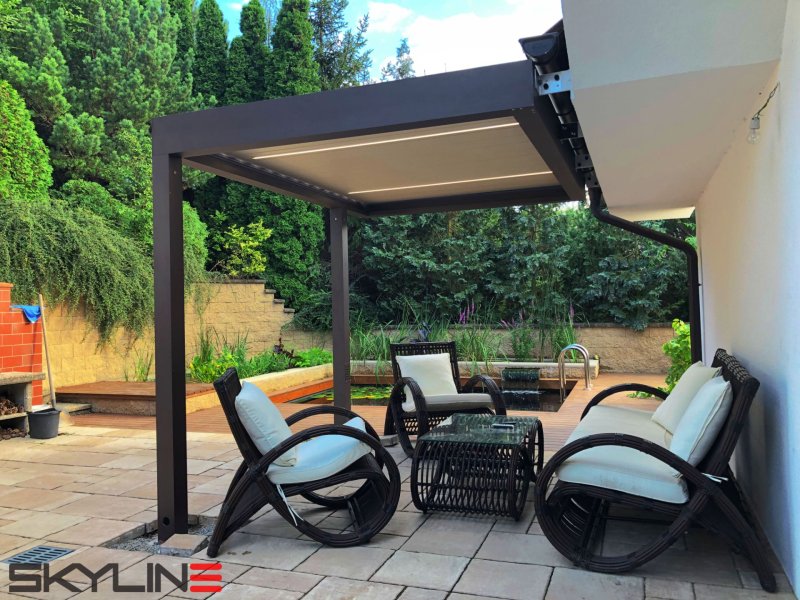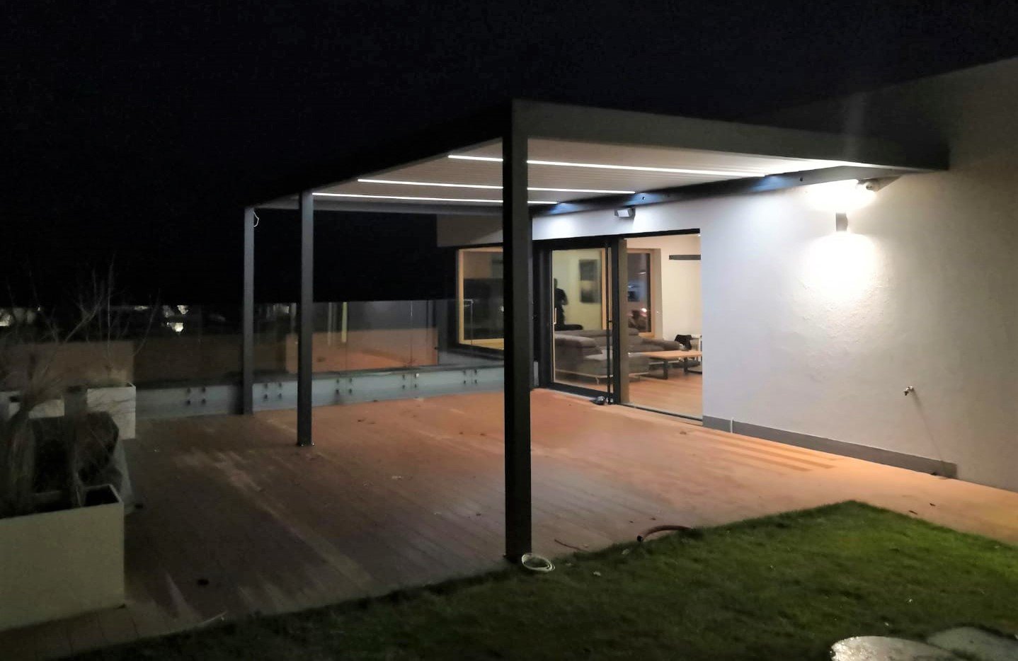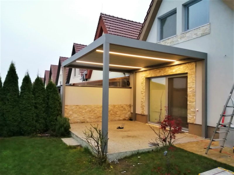 Bioklimatická pergola u rodinného domu s LED osvětlením